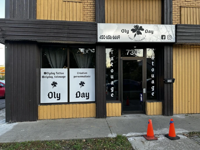 Oly Day Tattoo aménageait un nouveau local de tatouage à Longueuil et souhaitait une identité visuelle extérieure forte, tout en respectant les besoins spécifiques liés à l’activité de tatouage. Le défi principal était de créer une vitrine professionnelle, lisible et distinctive, tout en assurant un niveau élevé d’intimité pour les clients durant les séances. Le client recherchait une solution équilibrée entre visibilité commerciale, esthétique sobre et confidentialité intérieure.