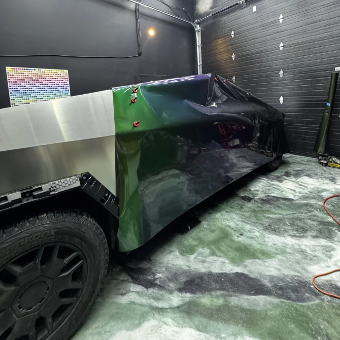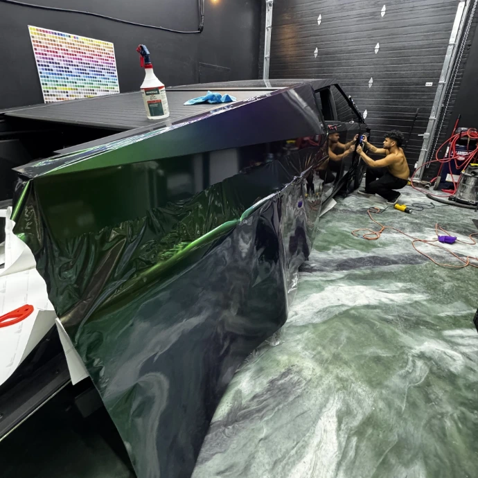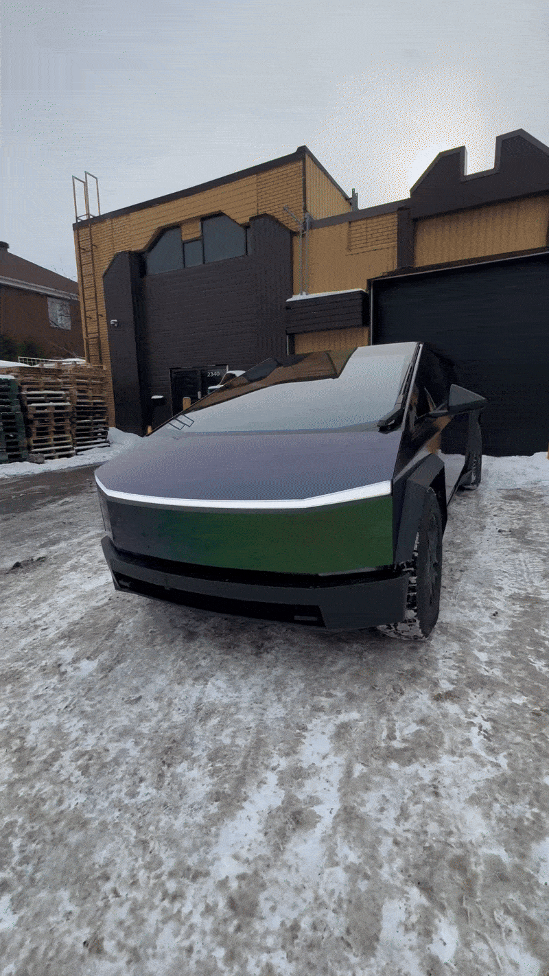 Ce projet a été réalisé pour un client souhaitant transformer radicalement l’apparence de son Cybertruck avec un wrap complet haut de gamme. L’objectif n’était pas simplement de changer la couleur, mais de créer un véhicule véritablement unique, avec une teinte évolutive offrant plusieurs nuances selon la lumière et l’angle de vue.